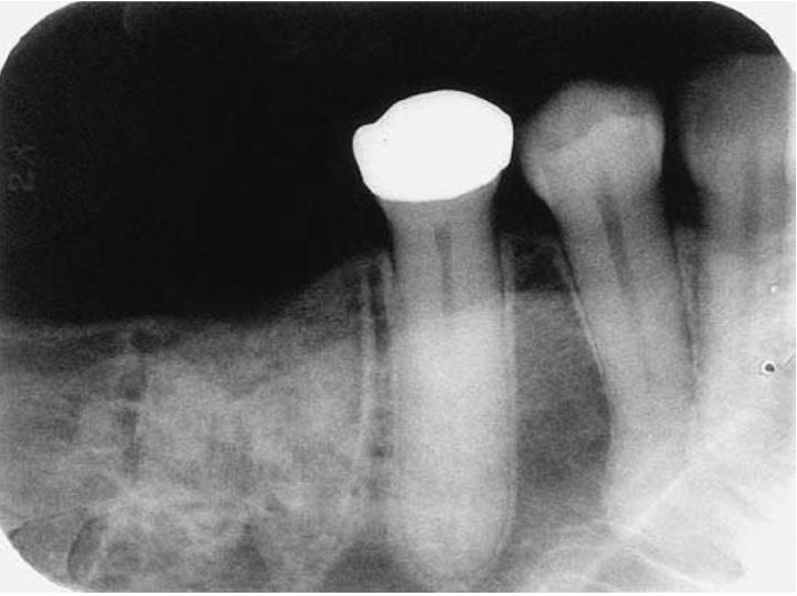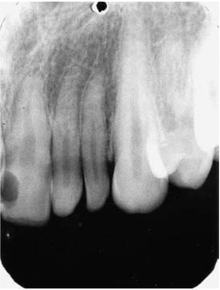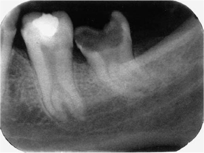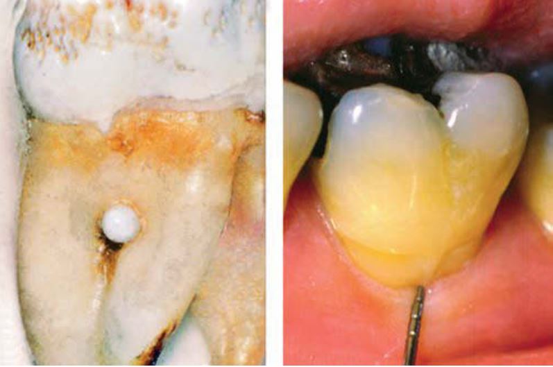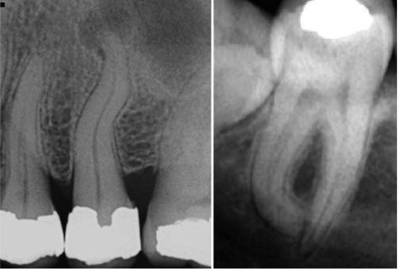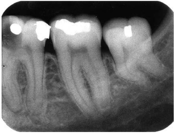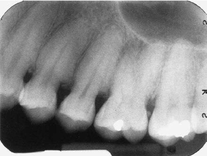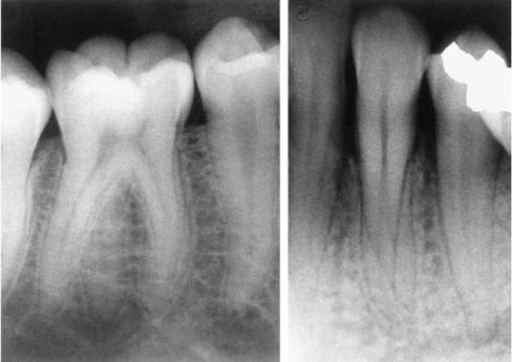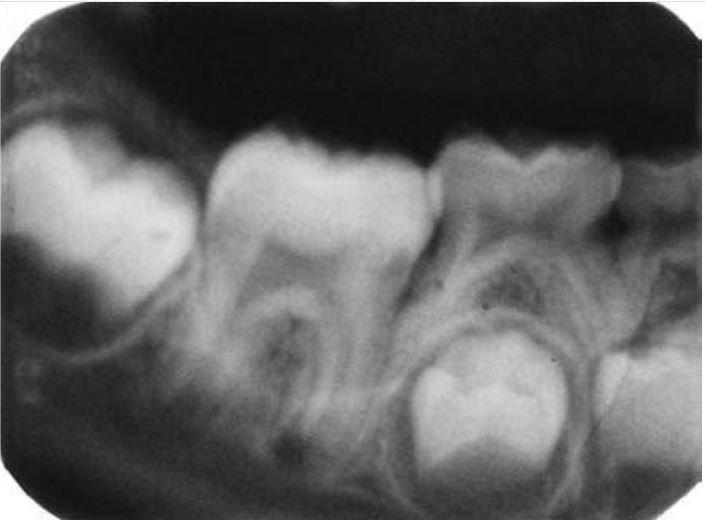 Khi chân răng phân kì về phía ngoài hoặc trong thì trên X quang sẽ có hình ảnh “mắt bò”, với điểm trung tâm là ống tủy.