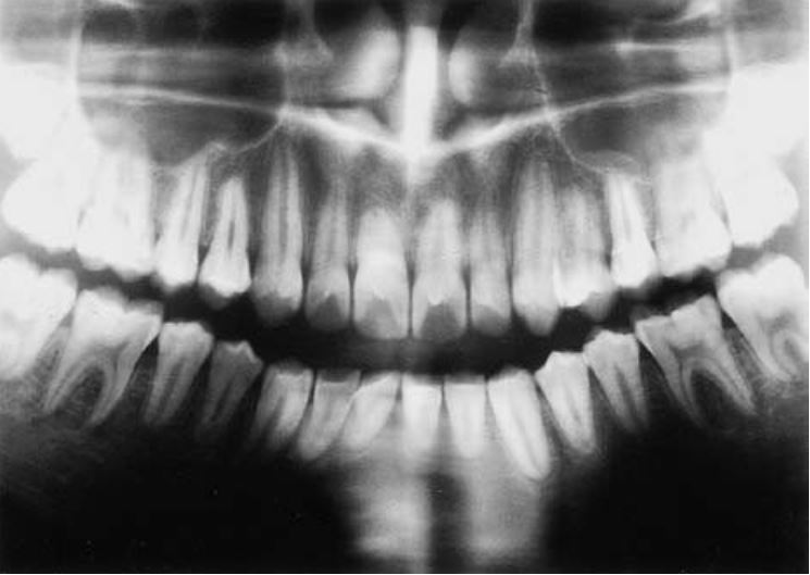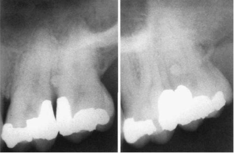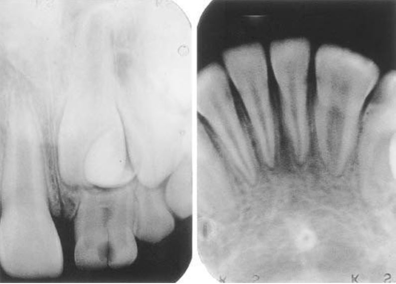 Trên phim thì thấy răng sinh đôi chỉ có một buồng tủy rất rộng, chân răng to, thân răng chẻ đôi. Tuy vậy vẫn còn nhiều biến thể khác.