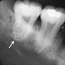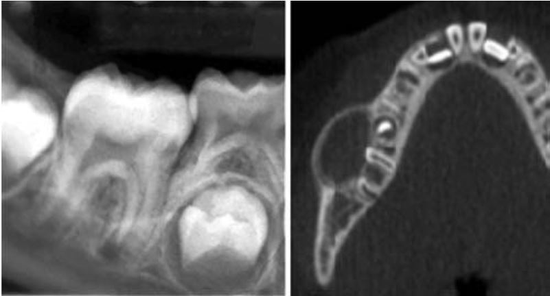 Nang được đặc trưng bởi khối thấu quang hình bán nguyệt, chồng lên chân răng ngoài, đôi lúc nang mở về phía xa. Trên phim mặt nhai thấy răng bị đẩy về phía trong.