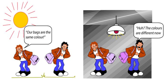Hiện tượng 2 vật thể trông có vẻ là cùng màu khi quan sát dưới 1 điều kiện nào đó, nhưng lại khác màu khi quan sát dưới điều kiện khác, được gọi là hiện tượng metame.