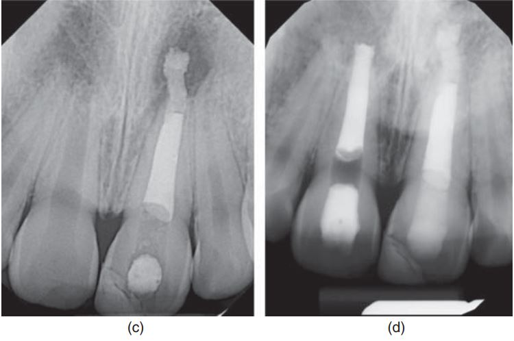 Hình 17.8. (c) Phần ống tủy còn lại được trám bằng composite. (d) X quang 3.5 năm sau. Chóp răng đóng hoàn toàn và sự lành thương của mô quanh chóp. Bệnh nhân đang điều trị chỉnh nha.