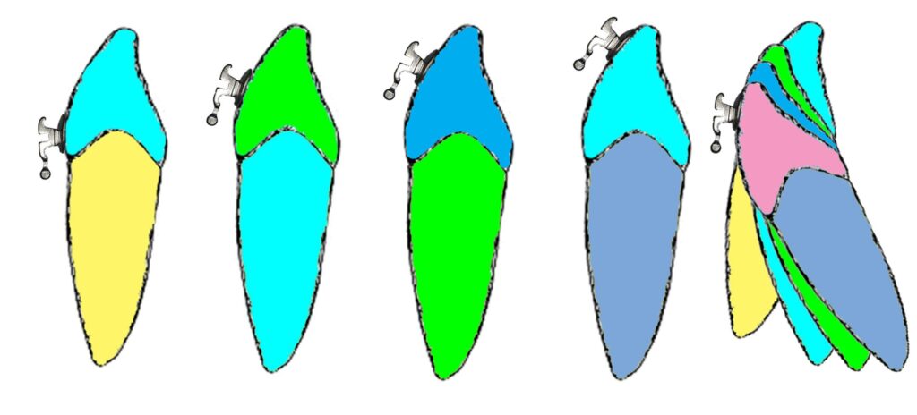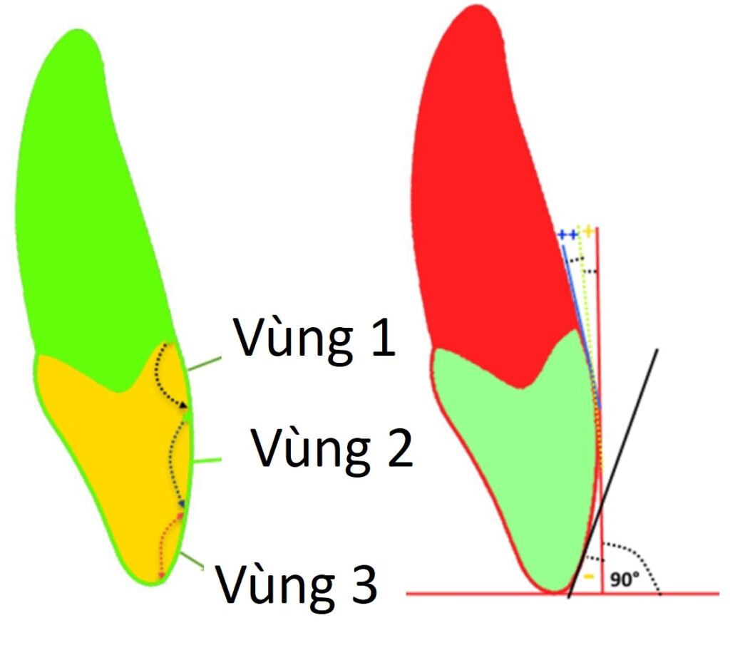 Hình 20. Hình thái mặt ngoài của răng có thể được chia thành ba vùng. Vùng 2 là giữa thân răng lâm sàng. Đây là vùng mà Andrew đã đo độ nghiêng của răng và chủ trương gắn mắc cài ở vùng giữa này. Vùng 1 là từ nướu đến vùng giữa (còn gọi là vùng nướu). Vùng này có torque dương lớn hơn vùng 2. Nếu cần gắn mắc cài ở vùng này thì nó phải có torque tăng. Giả sử vùng 1 này có torque +12°, vùng giữa có torque +7°. Gắn mắc cài có torque +7° vào vùng nướu (vùng 1) này sẽ dẫn đến kết quả là vùng 1 nghiêng +7° so với mặt phẳng vuông góc với mặt phẳng nhai. Vì vùng 1 giảm đi 5° độ nghiêng nên sẽ tự động giảm độ nghiêng của vùng 2, khiến cho vùng 2 chỉ còn nghiêng 2° so với mặt phẳng vuông góc với với mặt phẳng nhai. Vì vậy, nói chung là việc gắn mắc cài về phía nướu sẽ dẫn đến tạo torque âm nhiều hơn vì chúng ta lấy phần giữa của thân răng lâm sàng làm tham chiếu để đo độ nghiêng. Vùng 3 nằm ở vị trí gần về phía mặt nhai. Nếu muốn gắn mắc cài vào vùng này thì mắc cài phải có torque âm để giữ cho các phần khác của mặt ngoài thân răng có độ nghiêng tối ưu. Gắn mắc cài có torque dương ở vùng 3 sẽ dẫn đến độ nghiêng dương của vùng răng này, do đó làm tăng độ nghiêng dương của các vùng khác của thân răng. Giả sử mắc cài có torque +7° được gắn ở vùng 3 (vùng 3 có độ nghiêng -5° so với mặt phẳng vuông góc với mặt phẳng nhai). Khi đó, độ nghiêng vùng 3 sẽ trở thành +7° khiến cho vùng 2 sẽ trở thành +19°.