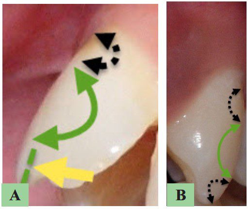 Hình 22. A, Mặt ngoài răng cửa giữa hàm trên. B, Mặt ngoài răng nanh. Mặt ngoài răng cửa ít lồi hơn răng nanh nên sự thay đổi vị trí mắc cài trên răng nanh có tác động rõ nét hơn đến sự thay đổi độ nghiêng so với răng cửa. Sự thay đổi sẽ lớn hơn nếu mắc cài được đặt ở nướu vì vùng nướu có độ dốc lớn.