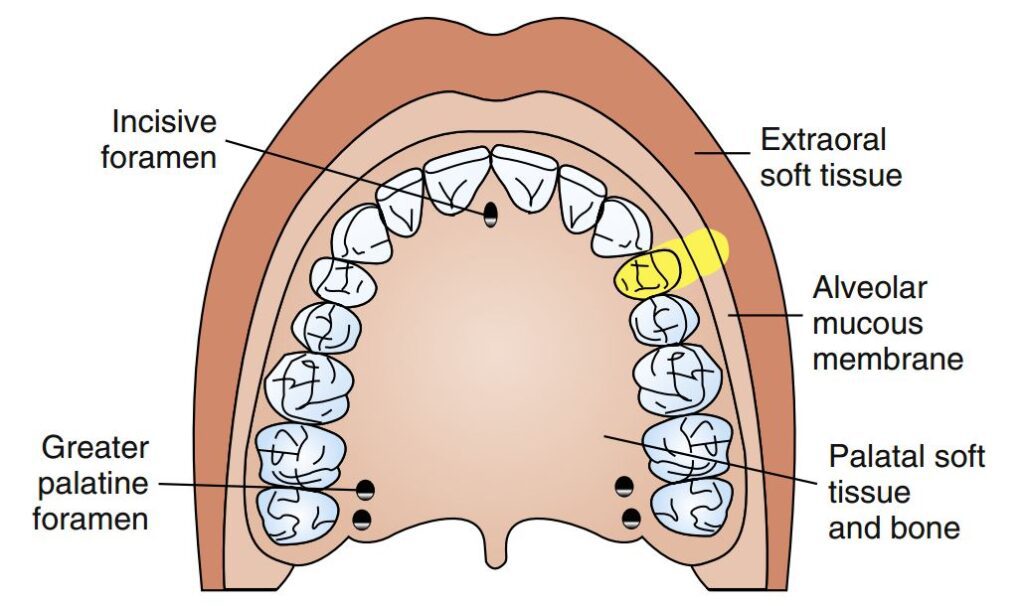 2. Xương đặc bao phủ quanh chóp răng (chỉ có thể xác định bằng cách chích thử và nhận ra, hầu hết là ở R6 hàm trên ở trẻ em vì nó nằm ở vị trí xương gò má khá dày). Chóp răng cửa giữa ở người trưởng thành cũng có thể bị phủ bởi xương dày (ví dụ vùng mũi).