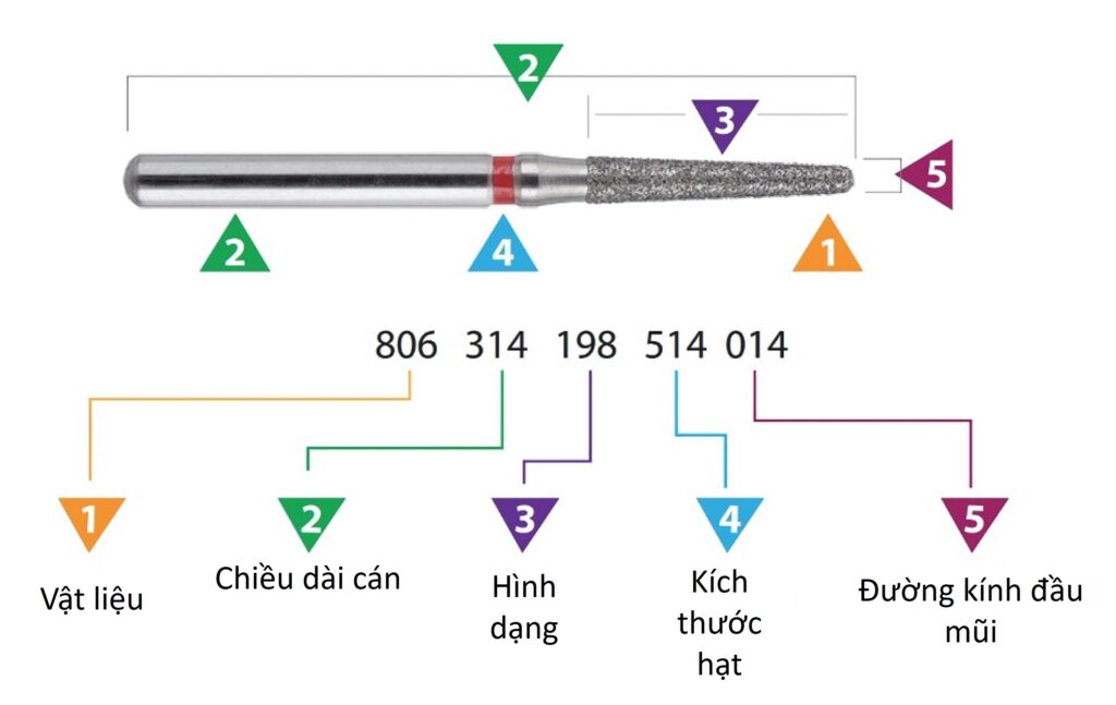Vì lý do này, mũi khoan nha khoa có mã tiêu chuẩn (hay mã ISO) mà tất cả các nhà sản xuất đều sử dụng theo cách tương tự và do đó giúp chúng ta dễ dàng xác định chính xác mũi khoan cần thiết. Mã ISO được tạo ra có tính đến các thông số khác nhau của mũi khoan và giúp phân biệt các loại mũi khoan nha khoa khác nhau.