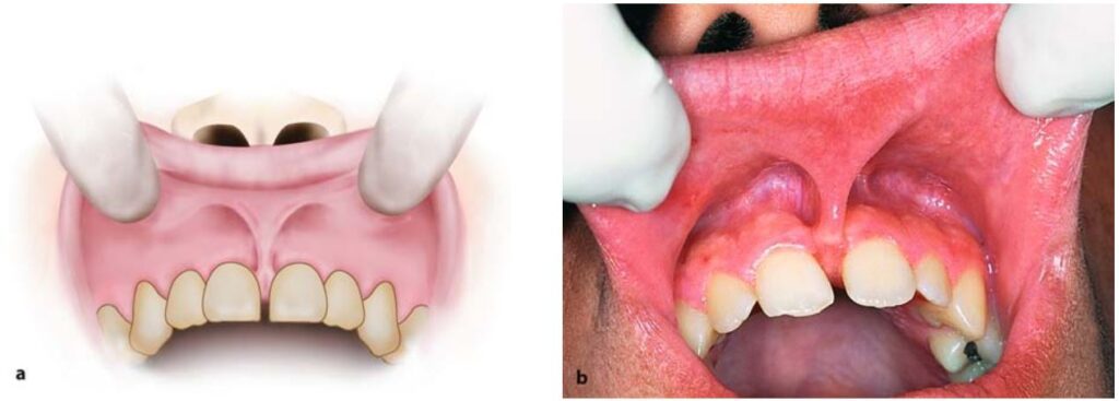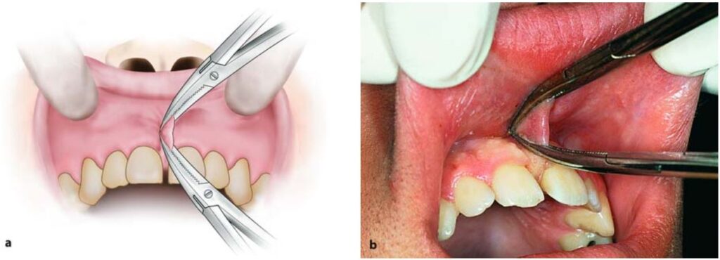 Trong nhiều trường hợp thực hiện hàm giả toàn bộ ở hàm trên hay điều trị chỉnh nha ở người trẻ đòi hỏi phải cắt bỏ thắng môi, má hoặc lưỡi nếu chúng gây cản trở (H10.72).