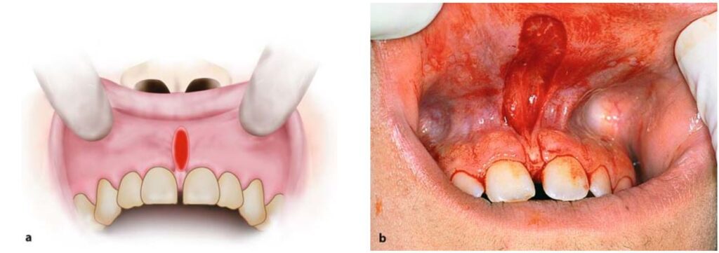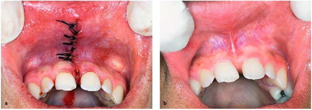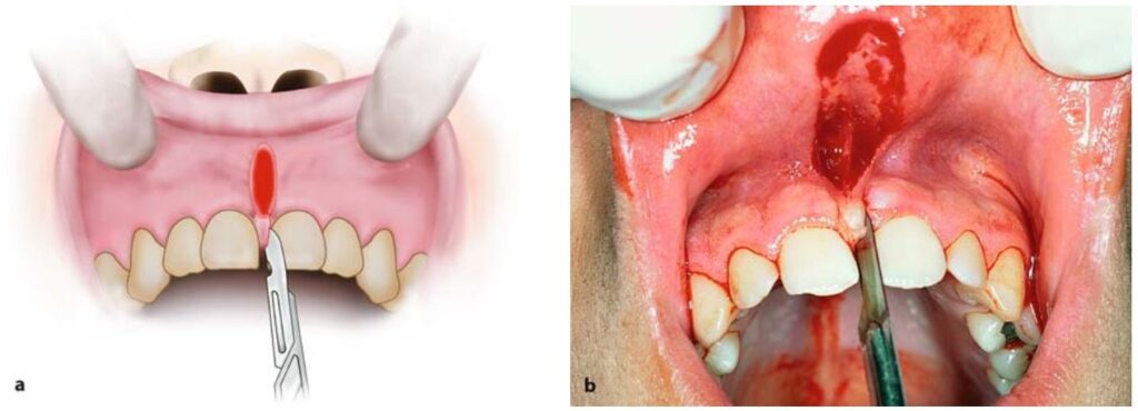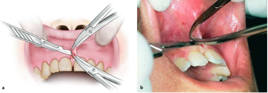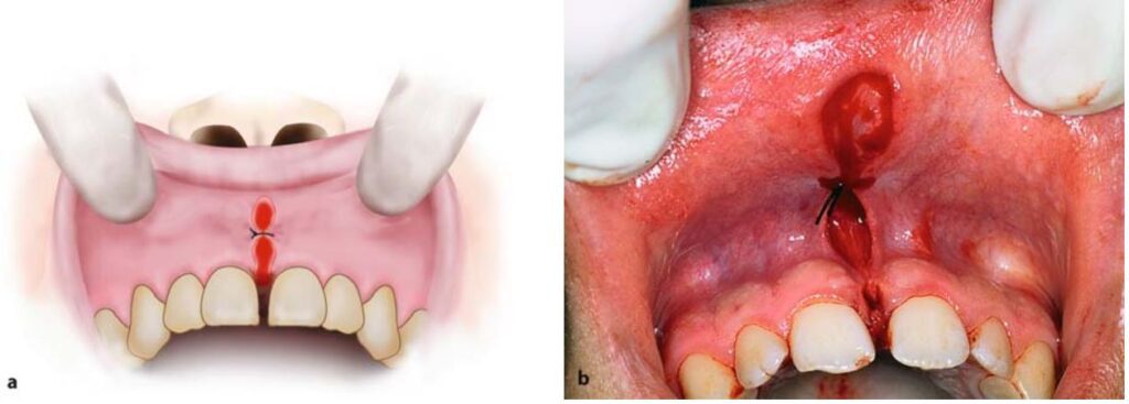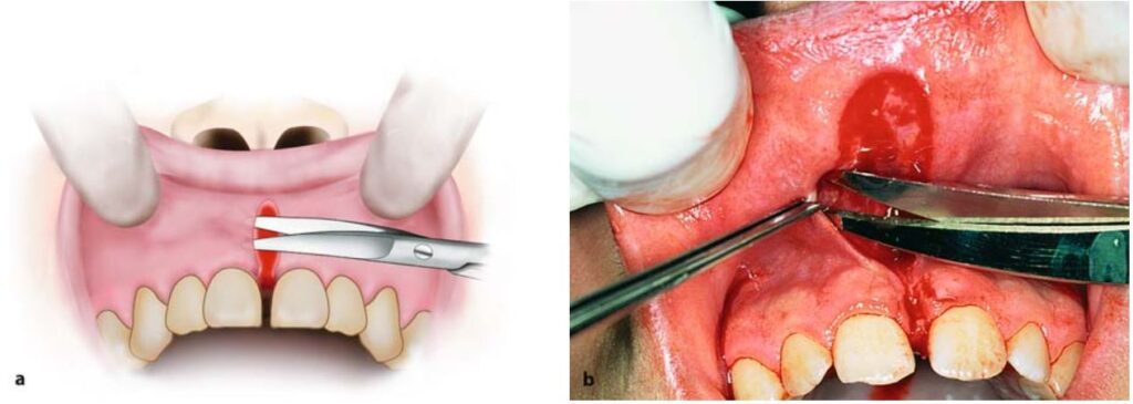 Nếu thắng môi quá dày và có khe hở quá rộng giữa 2 răng cửa thì thường cắt bỏ luôn phần mô mềm ở giữa và sau 2 răng cửa này (H10.79).