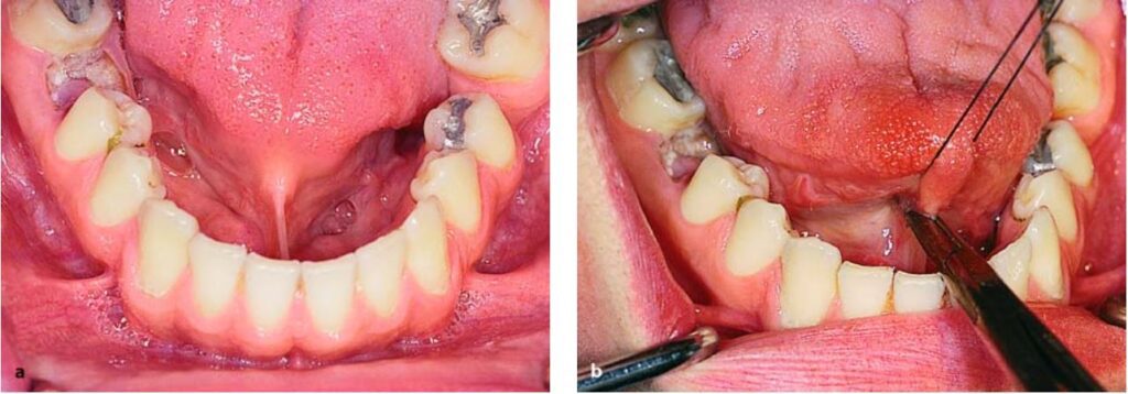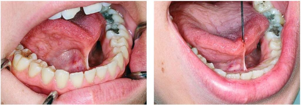 Ở hàm dưới, thắng lưỡi cũng có thể gây vấn đề, ví dụ như dính lưỡi, có thể hoàn toàn hoặc không hoàn toàn (H10.73).