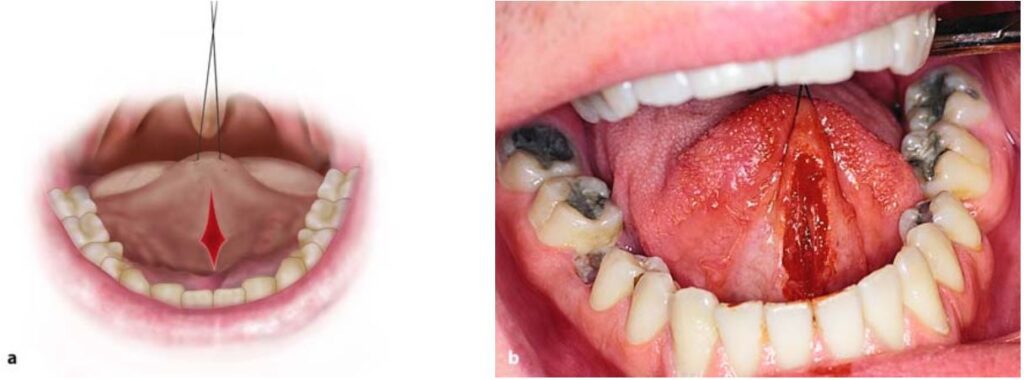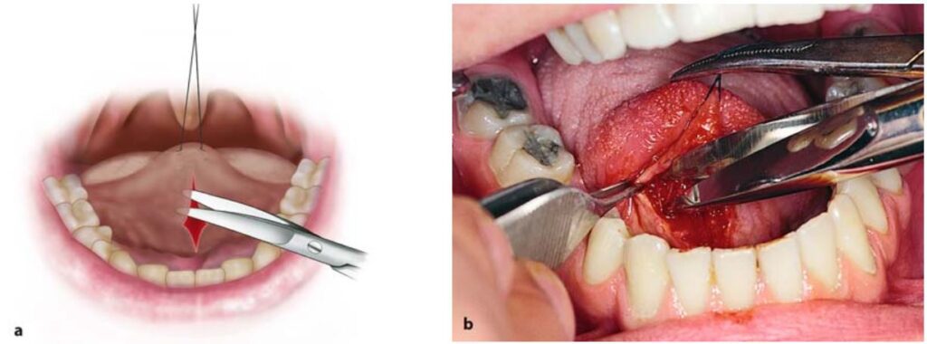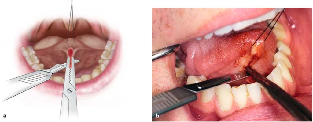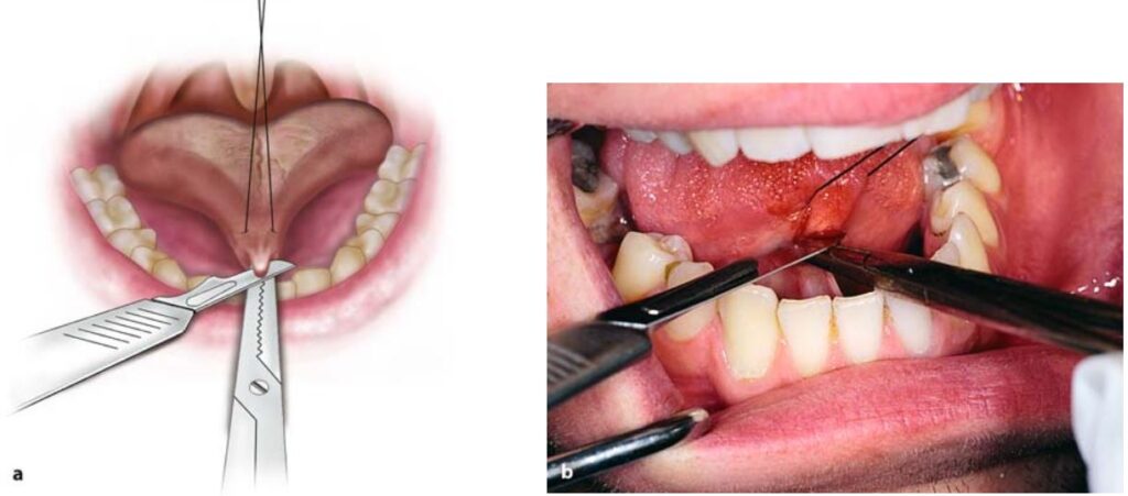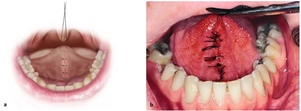 Sau khi gây tê thì lưỡi được kéo lên trên và lui sau bằng một mũi khâu xuyên qua đầu lưỡi.