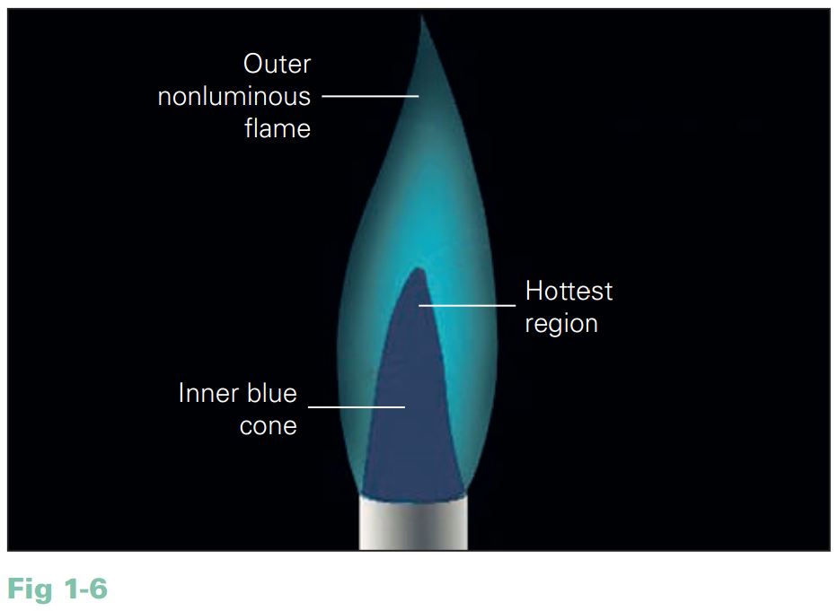 Ngọn lửa sáng sẽ có màu xanh dương, càng xanh thì càng nóng. Điều chỉnh luồng gas và khí để có được kích thước ngọn lửa như ý với 2 vùng màu xanh riêng biệt . Phần nóng nhất của ngọn lửa là đầu trên cùng phần ngọn lửa xanh bên trong (H1.6).