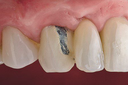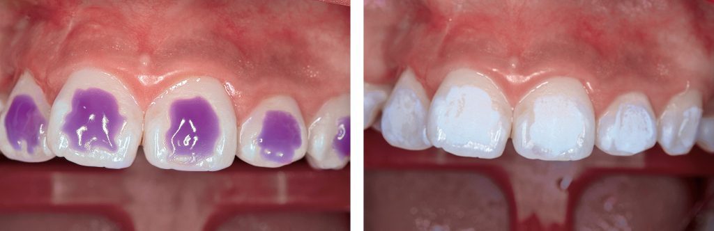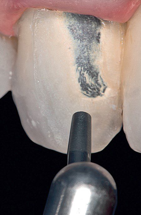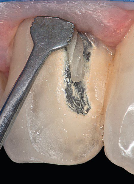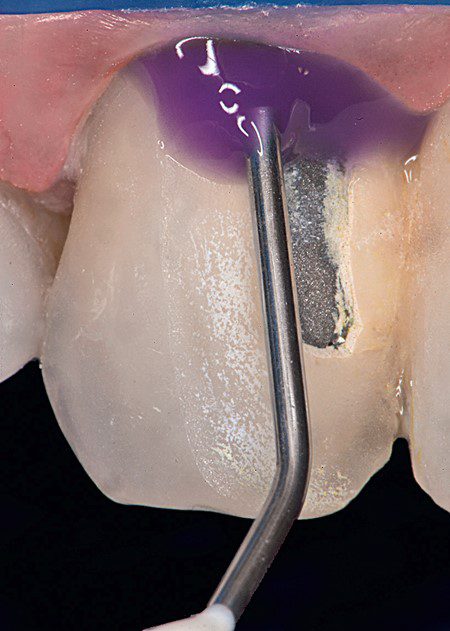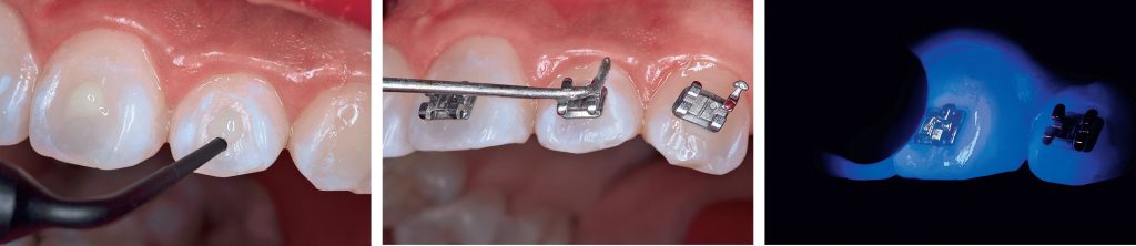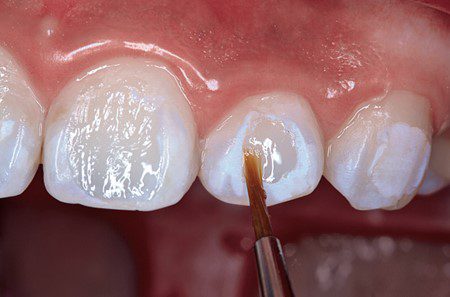 Hình 17. Trước khi gắn mắc cài chỉnh nha, mặt ngoài của răng hàm trên được làm sạch bằng pumice, rửa sạch và làm khô.