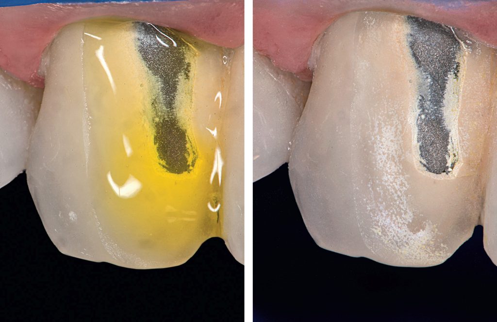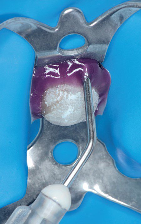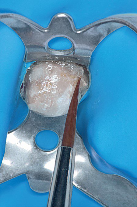 Hình 13. Sau khi kẹp và đê cao su được đặt ổn định, men răng được etching trong 15 giây bằng gel axit photphoric 37,5%, rửa sạch trong 5 giây và làm khô.