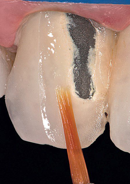Hình 6. Bôi silane lên bề mặt sứ đã được etching và thổi hơi nhẹ. Sau đó, bôi keo dán (All-Bond 3, Bisco) lên bề mặt sứ và bề mặt cổ răng rồi thổi hơi nhẹ.