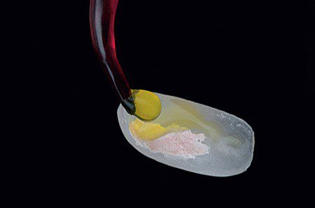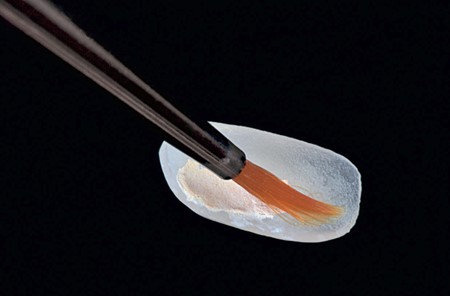 Hình 8. Keo dán hỗn hợp bond/silane có chứa MDP (chất kích hoạt liên kết sứ Clearfil trộn với Clearfil SE Bond Primer) được bôi lên mặt trong mảnh sứ đã etching.