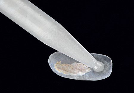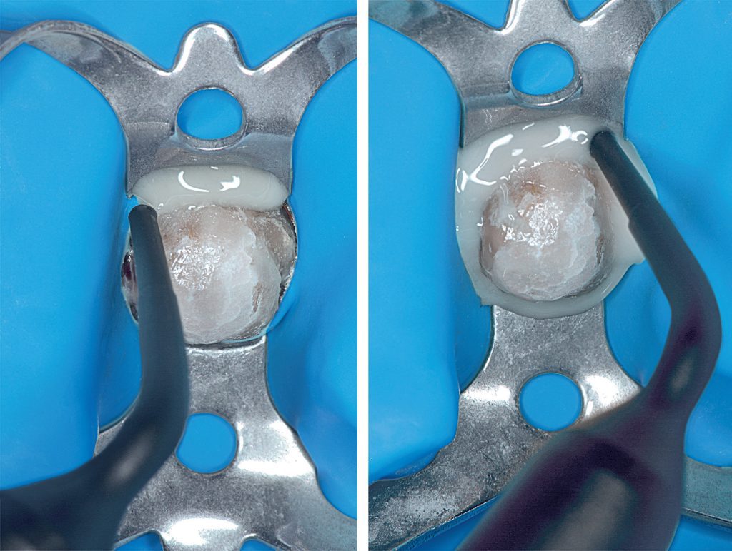 Hình 9. Composite lỏng màu A2 (GrandioSO Flow, VOCO) được bơm lên mặt trong mảnh sứ.