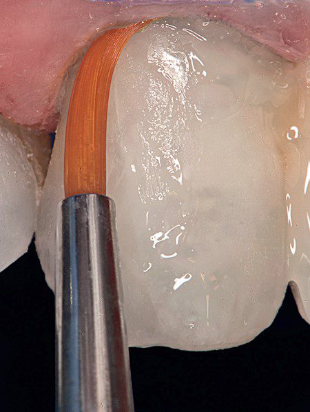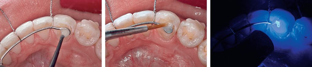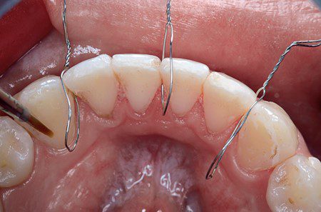 Hình 23. Sau khi các dây buộc cố định được đặt qua các điểm tiếp xúc, gel photphoric 37.5% (Gel Etchant) được bôi lên mặt trong răng nanh trong 15 giây, rửa sạch trong 5 giây và làm khô.