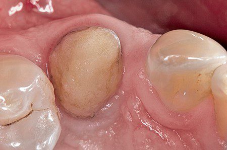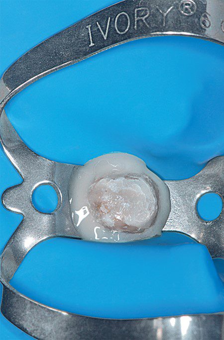 Hình 12. Mặt nhai R23 bị gãy với đường viền răng không đủ để duy trì kẹp đê cao su trong quá trình điều trị nội nha.