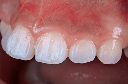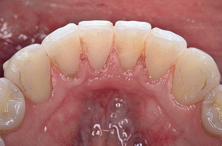 Hình 22. Hàm dưới sau khi tháo mắc cài chỉnh nha. Dán dây duy trì mặt lưỡi để ngăn ngừa tái phát chỉnh nha và cực kỳ có giá trị trong việc ổn định răng bị tổn thương nha chu và răng bị chấn thương. Bề mặt răng phải không có mảng bám, vôi răng và mảnh vụn trước khi dán duy trì mặt lưỡi. Mặt trong các răng hàm dưới được làm sạch bằng pumice, rửa sạch và làm khô.