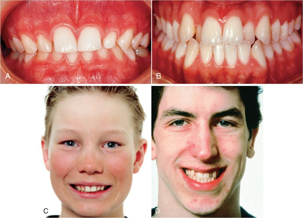 Hình 3-19. Hai bệnh nhân nam minh họa phạm vi khác biệt cá nhân về độ nghiêng thân răng của các răng từ răng nanh đến răng cối lớn. A và C, Bệnh nhân có nền xương hàm trên lớn với độ nghiêng trong (lưỡi) rõ rệt của các răng. B và D, Bệnh nhân lớn tuổi hơn có xương hàm trên nhỏ, xương hàm dưới lớn và độ nghiêng ngoài nhiều của các răng.