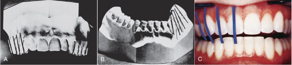 Có sự khác biệt rất lớn về độ nghiêng ngoài – trong của răng nanh và răng cối nhỏ hàm trên giữa các bệnh nhân. Bệnh nhân trong hình 3-19, A và C, có xương hàm trên rộng và tất cả các răng đều nghiêng nhiều về phía lưỡi. Trái ngược rõ rệt, bệnh nhân trong hình 3-19, B và D, có nền xương hàm trên hẹp và sự nghiêng ngoài rõ rệt ở tất cả các thân răng lâm sàng.