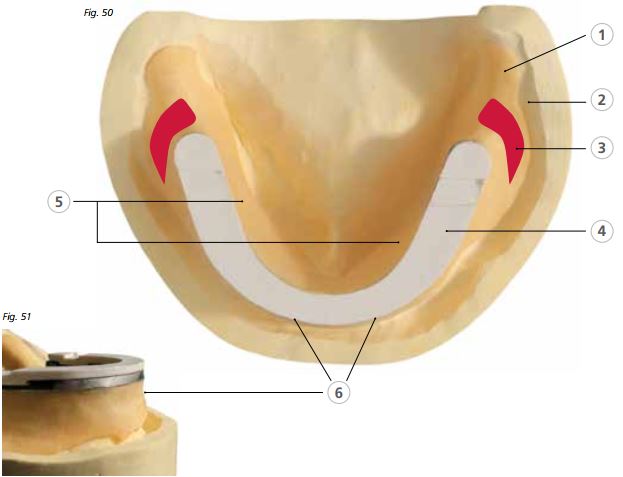 - Toàn bộ vùng gối hậu hàm (retromolar pad) phải được bao phủ bằng một lớp nhựa mỏng để đảm bảo tiếp xúc chính xác và không gây biến dạng mô khi lấy dấu.