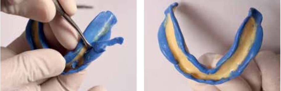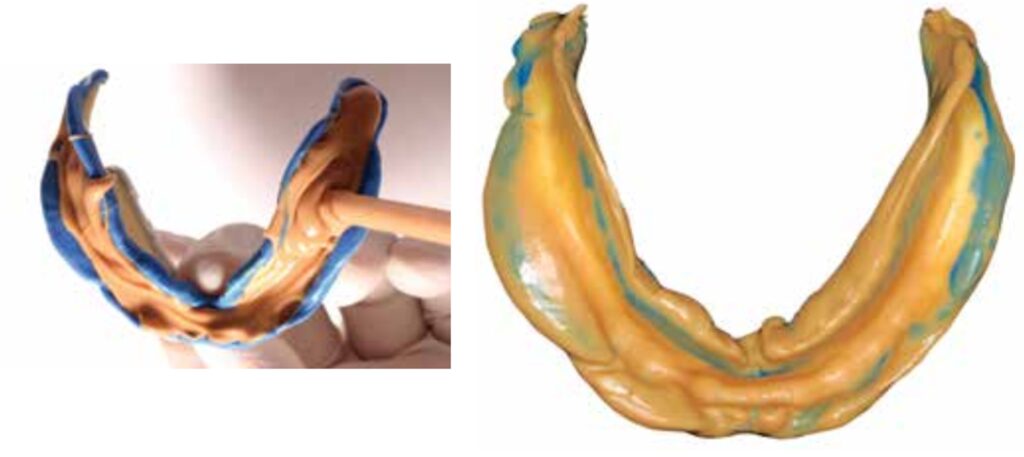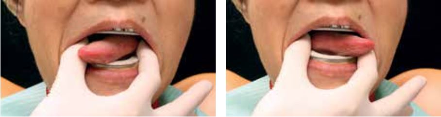 Ngoài ra, vị trí lùi về sau mà lưỡi thường đảm nhận khi há miệng cũng cần được ghi nhận trong quá trình lấy dấu để có thể đạt được sự khít kín hoàn toàn ở viền lưỡi. Các bước này đảm bảo viền kín dọc theo toàn bộ bờ hàm giả, giúp hàm chống lại lực nâng lên khi bệnh nhân há miệng.