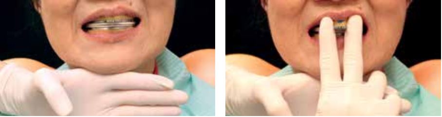 Khi lấy dấu sơ khởi và lấy dấu chức năng trong các trường hợp khó, bệnh nhân nên được yêu cầu há miệng một cách cẩn thận để khay dấu không bị nhấc lên. Sau đó giữ cố định khay trong miệng khoảng 10 giây (Hình 74).