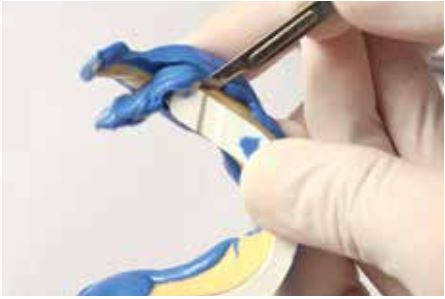 Loại bỏ phần vật liệu Heavy Body dư thừa ở mặt trong của khay bằng dao mổ (Hình 64 và 65).