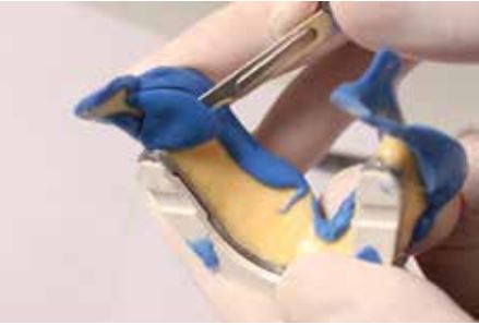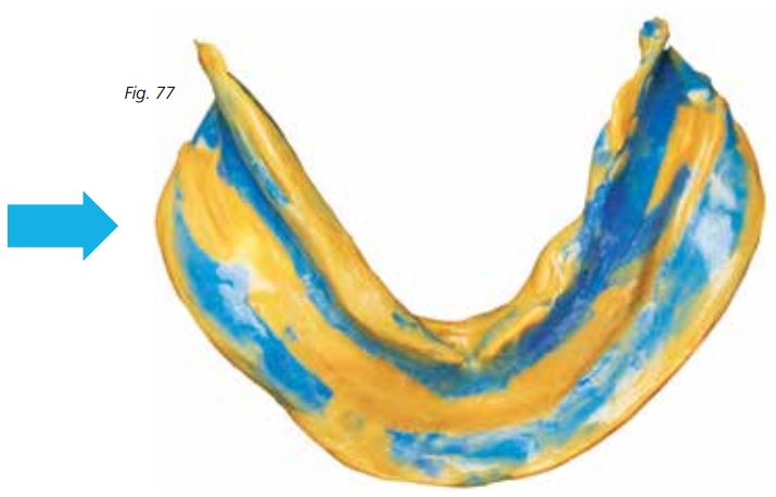 Loại bỏ phần vật liệu tạo vành khít dư thừa ở vùng xa của gối hậu hàm để đảm bảo hình thành điểm BTC (Hình 66).