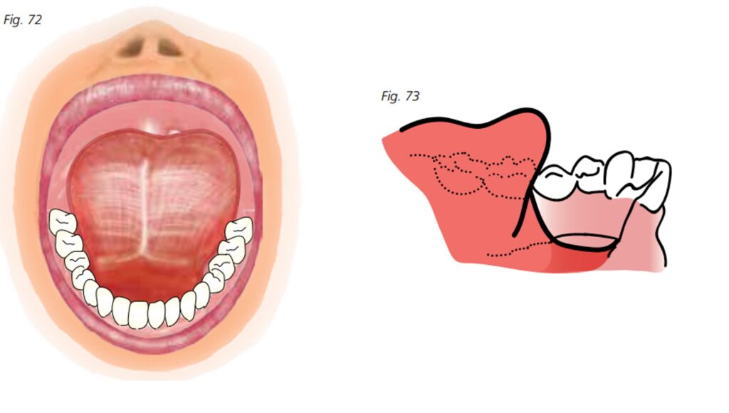 Đây là vùng nền hàm chịu lực chính, do đó viền dày sẽ giúp tăng độ ổn định và khả năng chịu lực của hàm giả, đồng thời giúp hàm tiếp xúc chặt với niêm mạc má. - Tăng độ dày viền ở vùng nếp dưới lưỡi (sublingual fold):
