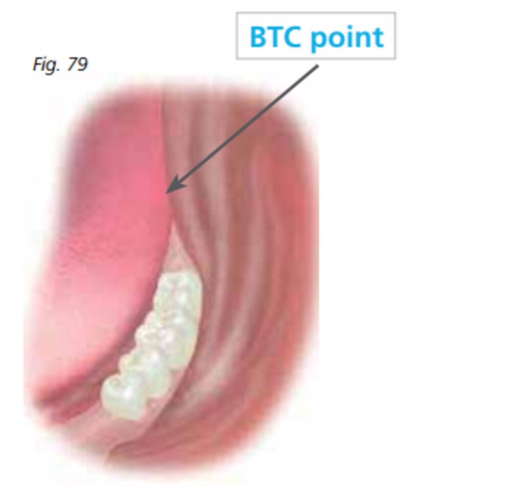 Khi từ từ chuyển từ tư thế mở miệng sang tư thế đóng miệng, điểm tiếp xúc giữa mặt bên của lưỡi và niêm mạc má – gọi là điểm BTC (Buccal mucosa–Tongue Contact) – sẽ được hình thành. Đây là một yếu tố sinh lý quan trọng giúp tạo ra áp suất âm cần thiết cho hiệu ứng hít dính của hàm giả dưới.